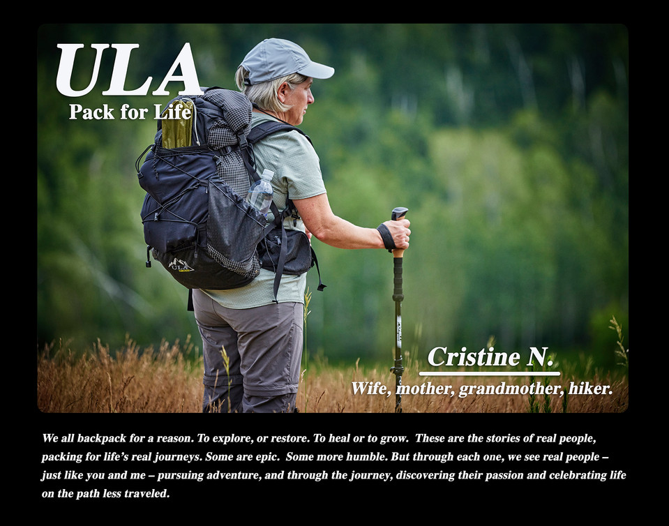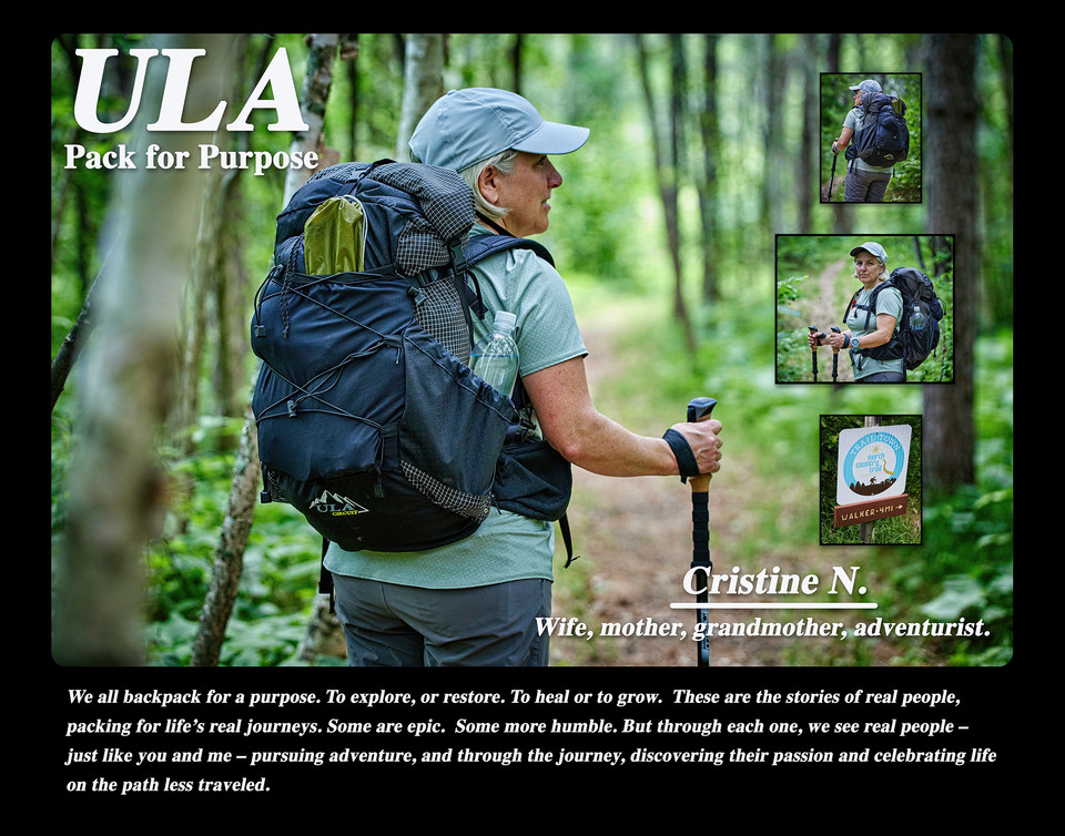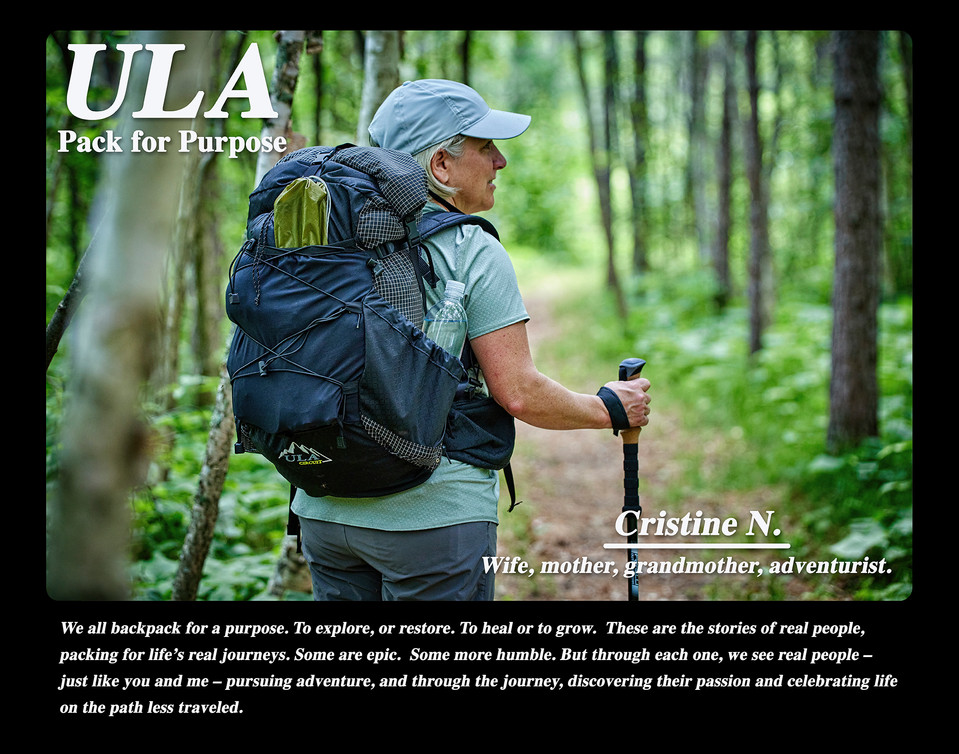 Her years as a stay-at-home mom and home educator behind her at the age of 52, Cristine took up back-country backpacking. She had new mountains to climb, new places to explore. Along the journey, Cristine and her ULA Circuit pack found a passion for section-hiking the Superior Hiking Trail of Minnesota’s North Country, and also discovered her adventure is just beginning.